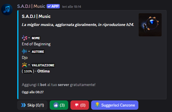 Il bot riprodurrà automaticamente le canzoni tra quelle disponibili, tutti potranno votare lo skip della canzone, suggerire nuove canzoni e valutare con un like o dislike la canzone in riproduzione al momento.