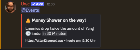 Never miss another event! The Alturi Event Calendar Bot automatically tracks and notifies your community about all upcoming in-game events with real-time updates and smart notifications.