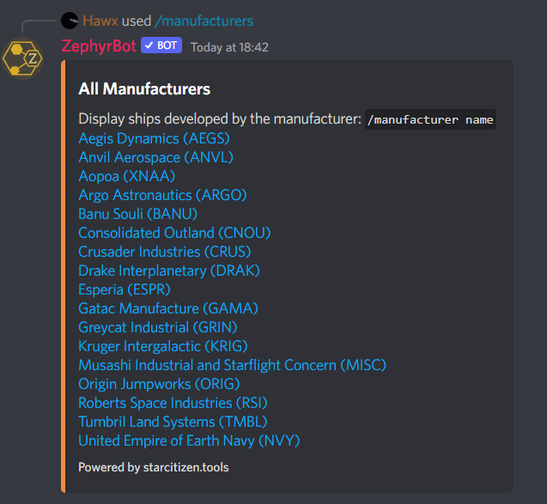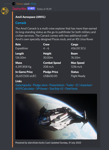 A Star Citizen Encyclopedia bot, covering ships, manufacturers & characters within the universe.