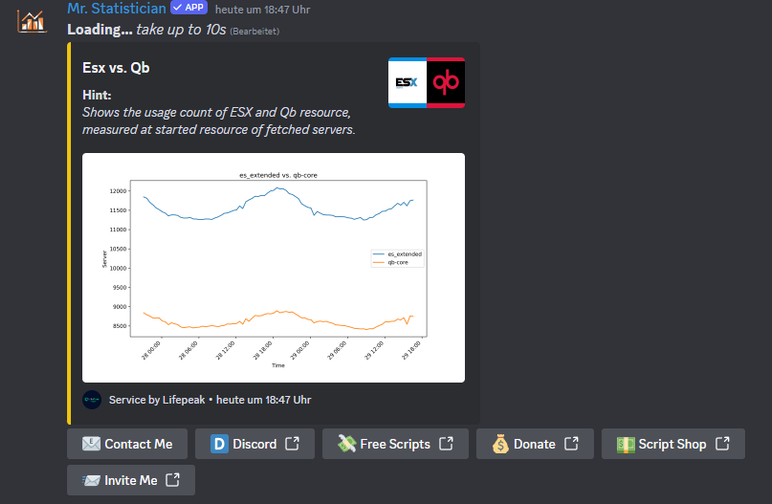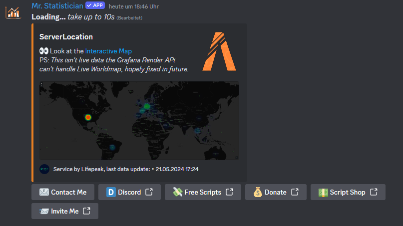 Features: General: ▸ Discover all FiveM server locations in a global interactive map ▸Show the percentage of used operating system for all Fivem servers ▸ Checkout player numbers for all FiveM Servers 📁 Resource : ▸ Get explicit data about the use of your chosen resource in a custom period of time. 👤 Player: ▸ Display data about your playtime which the bot fetched over time. ▸ Display data about your recently visited servers in the data the bot collected until now. 🌐 Server: ▸Track statistics of your preferred FiveM Server and stay updated about player numbers an more. ▸esx vs. qbcore Keep an eye at the most used roleplay frameworks and find out about their popularity.