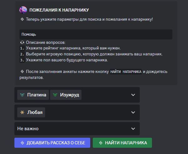 Кроме того, Вы сможете использовать поиск пользователей в своем сообществе по различным фильтрам и находить напарников из любого сообщества Discord, где установлен наш бот, чтобы пригласить их и сделать игровой опыт более приятным.