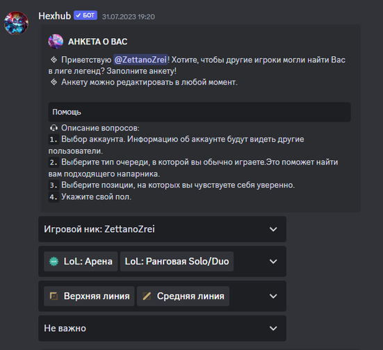 Наш бот способен привязать ваш профиль League of Legends к Discord и установить роли в соответствии с Вашим рейтингом, позицией и регионом, чтобы вы могли легко находить своих друзей и взаимодействовать с ними.