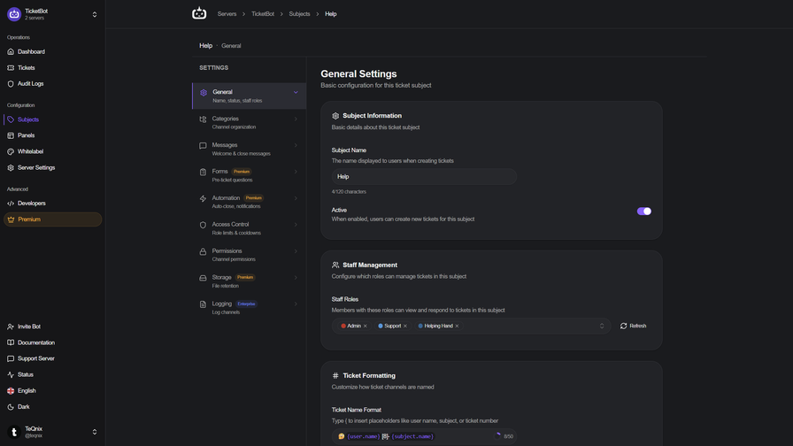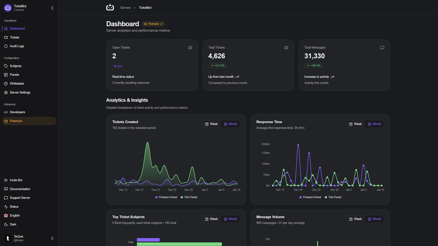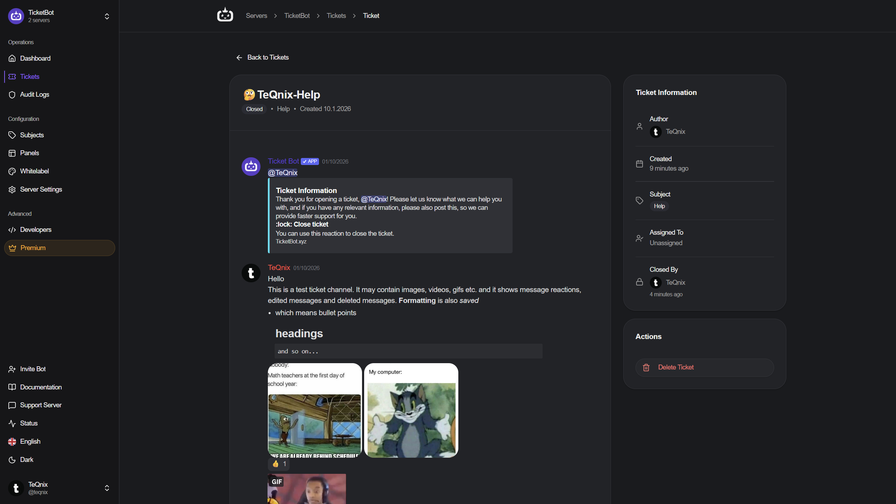 TicketBot is a premium ticket system with a website history for staff and users to access.