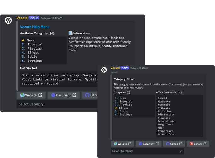 Vocard is a simple music bot. It leads to a comfortable experience which is user-friendly, It supports Soundcloud, Spotify, Twitch and more!