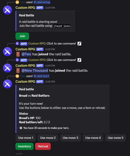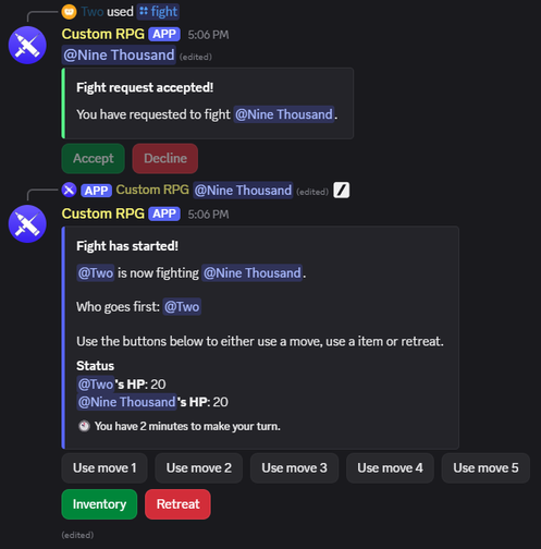 This bot is highly customizable while being easy to use. You can go from being able to damage users to setting custom messages of any fight actions. There are damaging, healing and DoT (damage over time) mechanics, but that's not all: there are a ton more features coming soon!