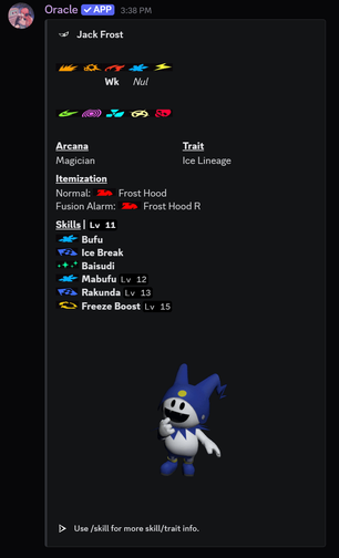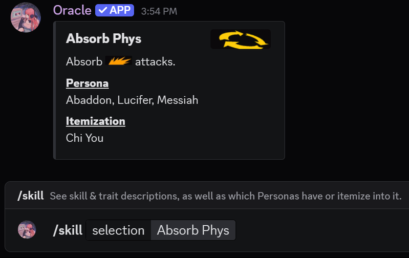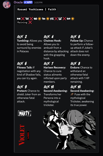 Oracle is your all-in-one Persona 5 Royal companion on Discord. Instantly look up persona stats, skill descriptions, confidant conversation guides, exam answers, and more.