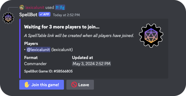 SpellBot helps you find Magic: The Gathering games on Convoke, SpellTable, Girudo, and Table Stream. Just looking to play a game of Commander? Run the command /lfg and SpellBot will help you out!
