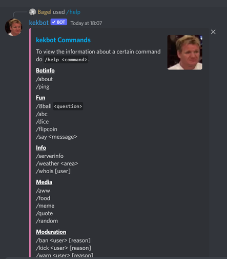 Project info: This bot is open source and is open to any contributions, our github is https://github.com/bagelwastaken/kekbot