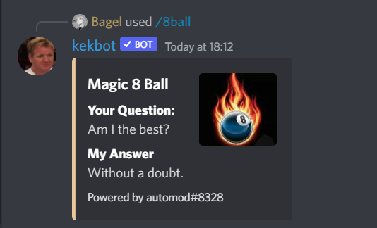 kekbot is a discord meme bot that is equipped with many functions and multipurpose commands! Look at memes from reddit, play games with your friends or just simply look at cat pictures all day long! Whatever it is we'll make sure you enjoy kekbot!