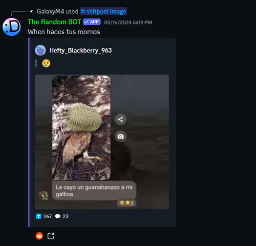El bot le sabe al shitpost, con el comando del mismo nombre, envía momos de reddit de servidores los cuales le saben 🤓.