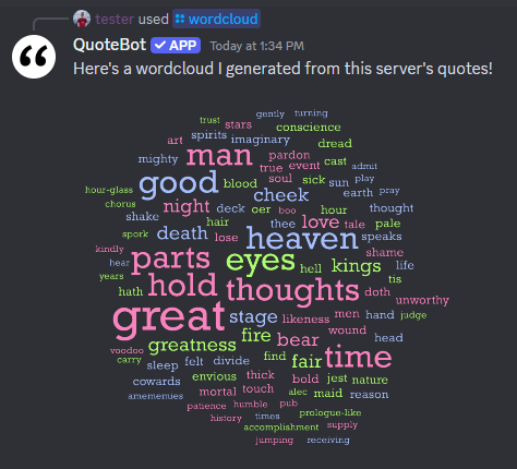 - /wordcloud - Generate a colorful cloud of words from the quotes said in your server. You can optionally use only quotes from a specific author. The size of a word is proportional to how often it's been said.
