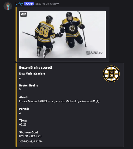 🏒 Sport Commands: Stay on top of your favourite NHL hockey games with live tracking! Get real-time updates, scores, and more, ensuring you never miss a moment of the action. Get started with >helpsports! More sports such as the NBA and NFL, are to come.