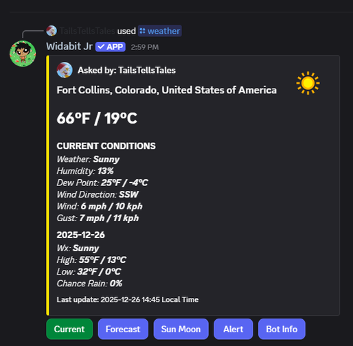 WEATHER - Tells you the current weather and extended forecast. You will not find a better Weather bot than this.