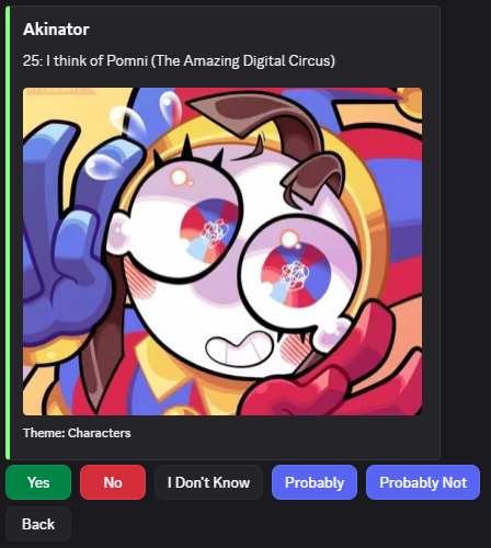 AKINATOR - The game is back on the bot and better than ever. The beloved Akinator will try to guess your character. Added (01/14/2026)