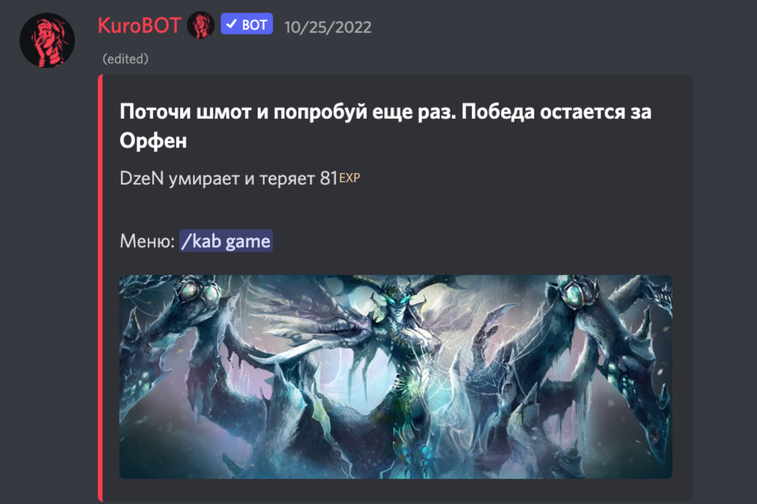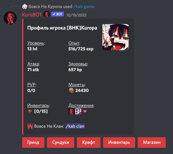 Так же, бот оснащен системой взаимодействий: если обычных слов тебе недостаточно, что бы выразить свои грязные эмоции - попробуй команду rp, и Куробот поможет тебе в этом!