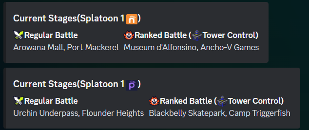 splatoon1 โ Sends the currently active stages plus the next two rotations