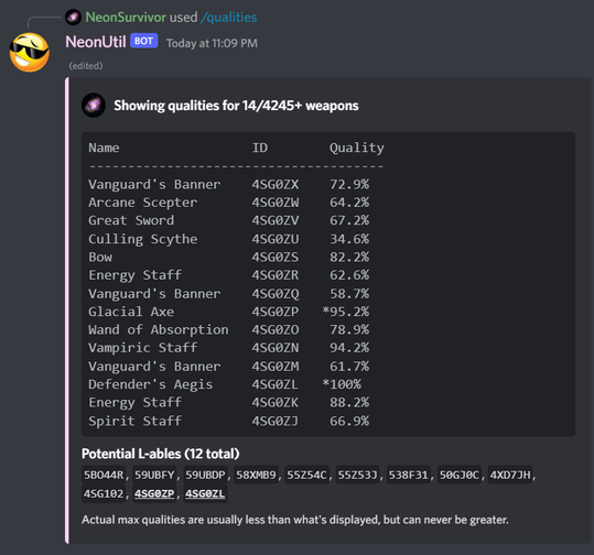 - Qualities: NeonUtil allows you to estimate the maximum quality of up to 15 weapons at a time, helping you quickly dismantle your weapons. You can also see other weapon properties like quality ranges and reroll chances.