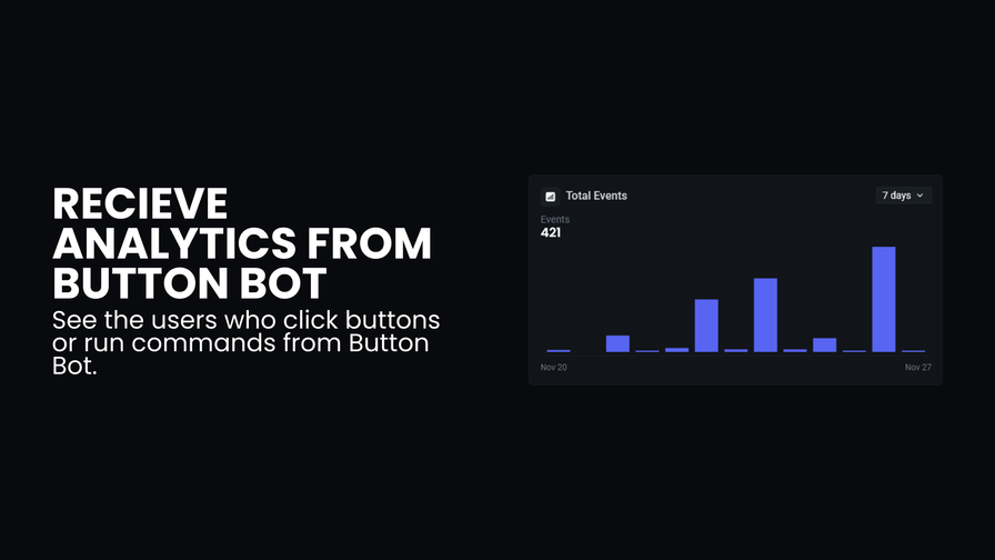 Button Bot is a customisable discord app that allows you to create interactive messages within discord. From role pickers to polls Button Bot can do it. The online dashboard allows you to control and see the output of Button Bot - you can see how users click and send buttons all from a simple graph.