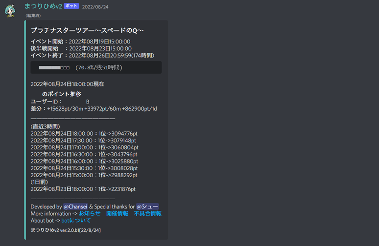 mltd-botはソーシャルゲーム「アイドルマスターミリオンライブ!シアターデイズ」と連動し、ゲーム内イベントのランキング情報をDiscordサーバーへ通知するbotです。