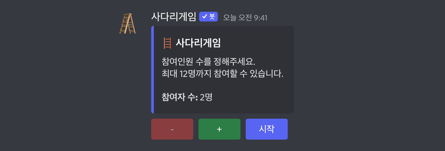 인생은 랜덤 — 사다리게임은 Discord에서 사다리게임을 진행할 수 있는 봇입니다. 최대 12명의 참여자를 추가하고, 원하는 만큼 당첨 개수를 설정한 뒤 게임을 시작하세요. 여러 명이 게임을 참여하는 상황에서 그룹을 나눌 때, 소규모 서버에서 이벤트 당첨자를 추첨할 때, 벌칙을 수행할 유저를 선정할 때, 다이렉트 메시지나 서버에서 /사다리게임을 입력하세요.