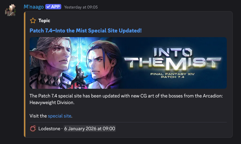 /theme→ Set a theme for your verified character's profile./setup lodestone→ Set up which channels receive automated Lodestone news updates. You can set or remove channels for each category of news. The Lodestone news categories are: Topic (Latest news, PLL's and patch notes), Notice (Secondary news), Maintenance (All kind of maintenances and their durations), Update (Outcome from maintenances), Status (Technical difficulties and server statuses). By default, this command requires Manage Channels permission to execute./setup filters→ Set up keyword filter blacklists to exclude certain Lodestone news. E.g. you can hide all "Ceremony of Eternal Bonding Reservation Restrictions" posts. By default, this command requires Manage Channels permission to execute.