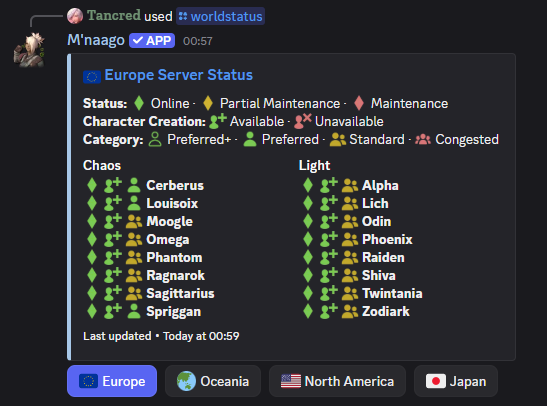 /help→ View information about the bot and how to use it./events→ View ongoing and upcoming FFXIV events such as Starlight Celebration or Live Letters./liveletter→ Shows information about the next or current Live Letter./maintenance→ View current maintenances, if any. Shows active maintenance schedules and their durations./when-is-reset→ Shows FFXIV daily and weekly resets./worldstatus→ Shows server status, character creation status and server congestion.