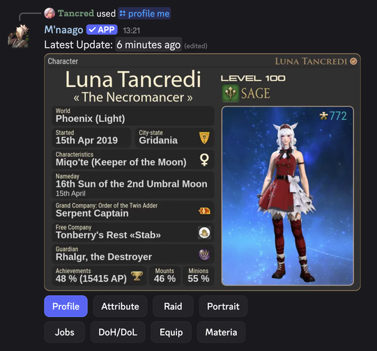 This Discord bot can provide character profiles for the MMORPG Final Fantasy XIV (FFXIV, FF14), send automated Lodestone news notifications, display current maintenances, live letters and server statuses.