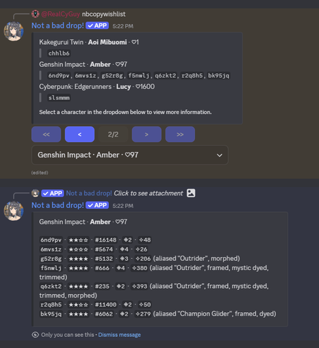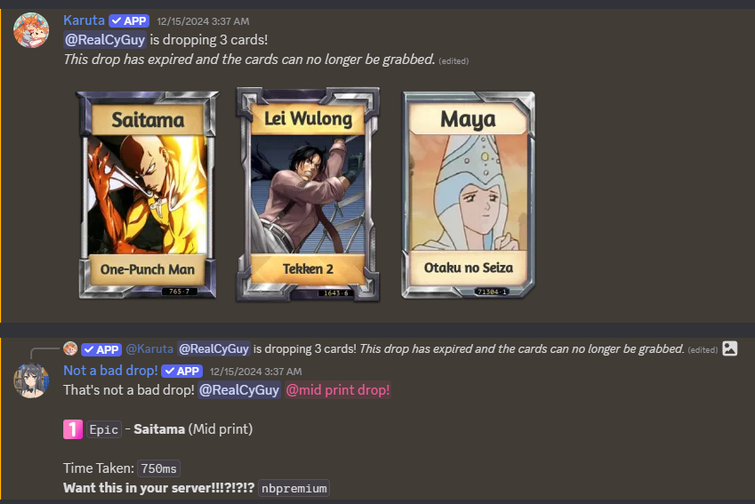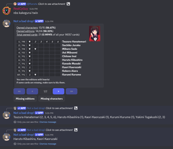Manual starring, card/series wishlist leaderboards, burn price multiplier, trading ad generation, card battle image generation, vanity calculator, flex channels, random number generator, embed extractor, trading bit calculator, random anime girl holding a programming book, see all images of a character, image of purchasable bit frames, series character checklist, "nice" print finder, inventory copier, trade tracker, upcoming character drops, compare many Karuta images, track series progress, and more!