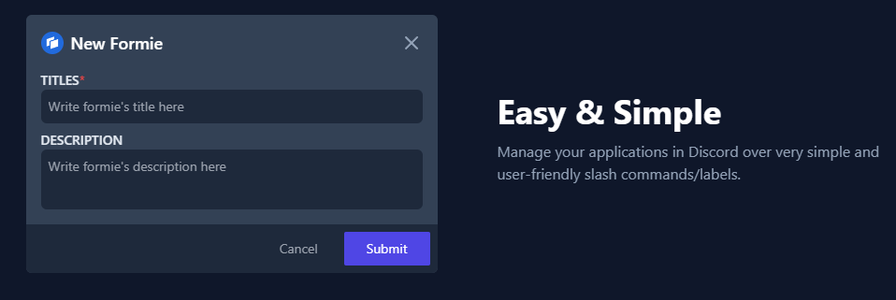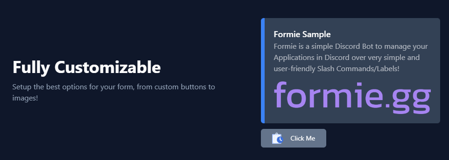 Formie is a feature-rich Discord bot empowering it's users to create their own forms in Discord over simple and user-friendly Slash Commands, menus, and Labels!