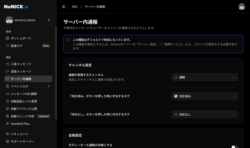 🚀 豊富な機能性 ... 小規模なサーバーから大規模なコミュニティまで、幅広いサーバーの運営をサポートする豊富な機能やコマンドを搭載しています。 🔰 使いやすい操作性 ... Botの導入や各機能の設定は全てダッシュボードに集約されており、ダッシュボードにアクセスするだけですぐに使用を開始することができます。 🔧 カスタマイズ可能 ... 各機能には豊富なカスタマイズオプションが用意されているため、各サーバーのニーズに合わせて自由に設定を行うことができます。 🛟 充実したサポート ... Botの使い方を網羅したドキュメントや、いつでも質問やお問い合わせが可能な公式サポートサーバーにより、誰でもBotの使用を開始することができます。 💰 無料で使用可能 ... 特定の機能を開放するために料金を支払う必要はありません。NoNICK.jsでは全ての機能を無料で使用することができます。 ✨ 高い信頼性 ... 現在、NoNICK.jsは1,000を超えるサーバーで導入されており、様々な規模のサーバー管理をサポートしています。
