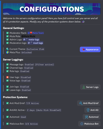 With all of that, enjoy a various of Management commands like "/scan", "/inspect" and Moderation such as "/ban", "/mute", "/kick". Customize your server appearance with amazing themes. Experience "Nature", "Space", "Discord", "Exclusive" or the "Classic" style of Meta.