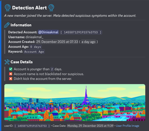 Keep your server clean - Becoming too popular or just despise scam / alt accounts? Enable the Anti Alt Module to get notified whenever an suspicious account joins your server. Set your limits and kick them automatically with Meta Anti Alt Detection Module and Auto Kicker!