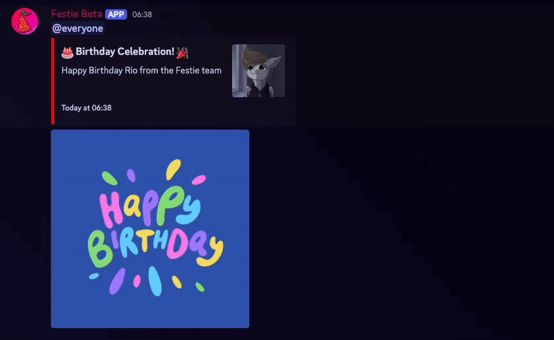 - Automatic Birthday Announcements - Festie posts personalised messages at midnight in your server's timezone