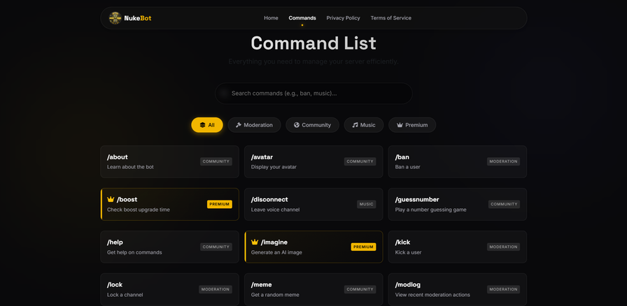 Nuke is a feature-packed Discord bot designed to elevate your server experience. Whether you’re engaging your community, keeping the peace as a moderator, enjoying your favorite tunes, or accessing exclusive premium tools, Nuke has everything you need.