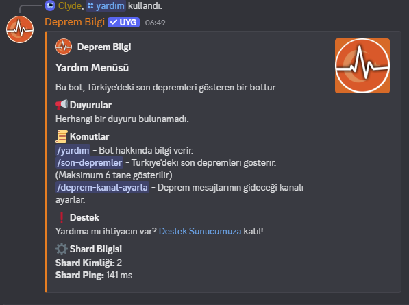 Deprem Bilgi, afet farkındalığını artırmak ve toplulukları bilgilendirmek için geliştirilmiş, sade ama işlevsel bir bottur. Kurulum sonrası otomatik olarak çalışır ve sizi sürekli güncel tutar.