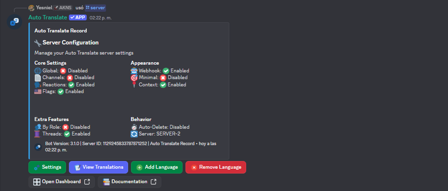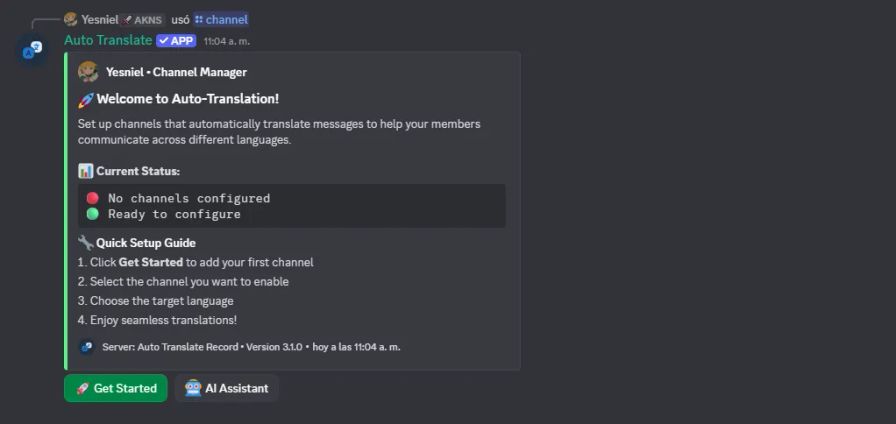 /ai | Auto Translate with AI. messageDescribe what you want to do (e.g., 'translate #general to spanish') |