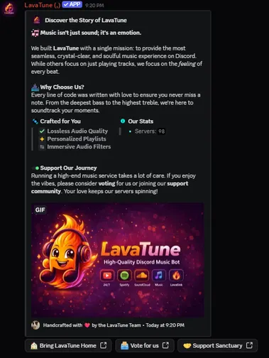 "we tried 4 music bots before lavatune. this is the only one that feels real audio quality and dosnet suck the audio "