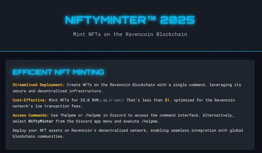 Nifty Minter is your ultimate tool for creating and managing NFTs on the Ravencoin blockchain directly from Discord. Streamline your NFT minting process, manage your assets, and engage with a vibrant community, all from within your Discord server.