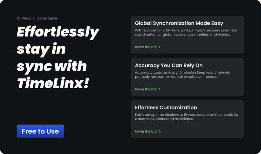 The Discord Timelinx Bot brings global time awareness to your community by automatically displaying real-time clocks for multiple countries directly in your voice channel names.