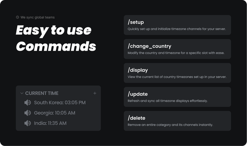Admins can set up, customize, or remove timezone slots with simple slash commands like /setup, /update, and /change_country. Whether you run a global gaming community, international team, or a worldwide fan hub — this bot keeps everyone in sync effortlessly!