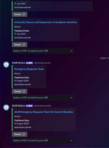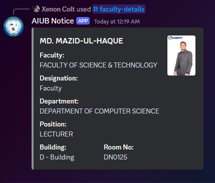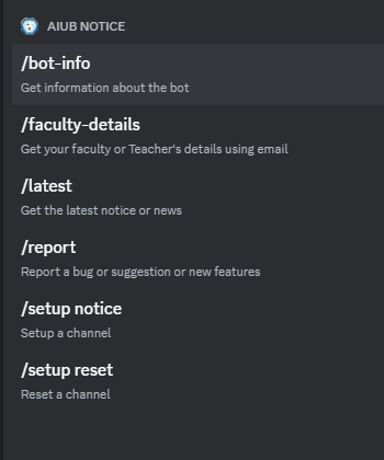 The AIUB Notice Bot is an unofficial Discord bot made for students, faculty, and staff of the American International University-Bangladesh (AIUB). It makes it easy to get the latest updates like announcements, academic schedules, registration deadlines, event info, faculty details, and seat plans, all directly from the AIUB noticeboard.