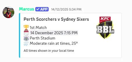 Using slash commands, Marcus can show you the fixture for AFL, BBL and A-League. For AFL matches, the predicted ladder, tips and power ranks powered by Squiggle modellers are also available.