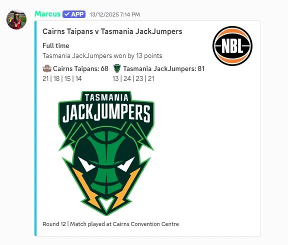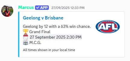 When Marcus is installed to a server, it can send match notifications two hours before a game starts, showing the teams playing, the start time, venue and weather (when relevant). For AFL games, match notifications include a match prediction from Squiggle models. A match summary is sent at the end of a game.