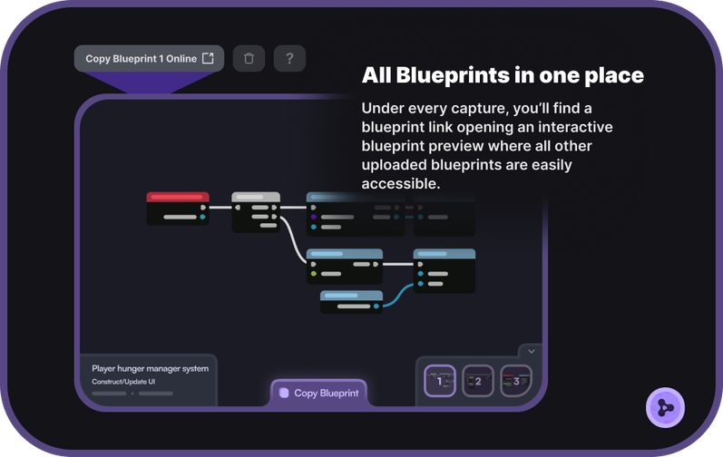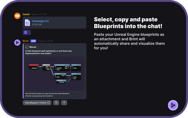 Brint allows Unreal Engine game developers to easily share their blueprints with other members on the server by simply selecting and copying their blueprint in the editor, copying it and back on Discord, pasting it as an attachment for Brint to process and visualize.