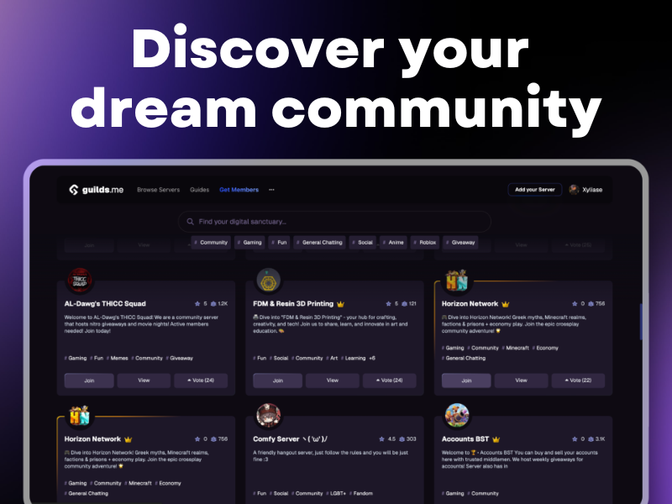 Discover the perfect Discord community with guilds.me. Our advanced platform not only helps you grow your own server but also connects you with vibrant communities that match your interests and needs. Whether you’re looking to join a new group or grow your own, our innovative indexing algorithm ensures that you find and attract the right people effortlessly.