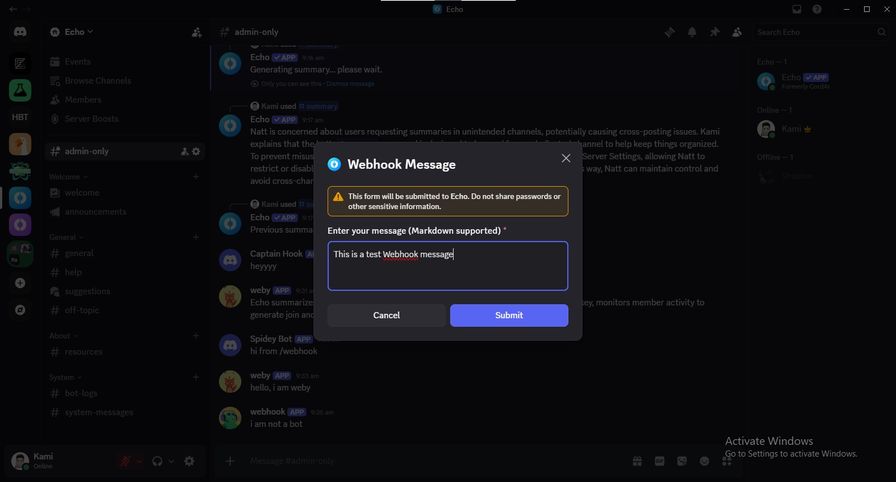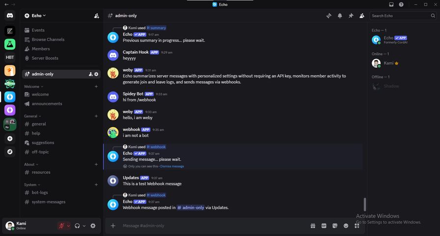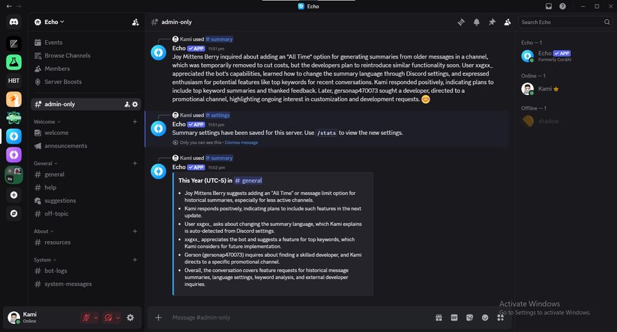 Echo summarizes server messages with personalized settings without requiring an API key, monitors member join and leave events for logging, and can send messages via webhooks.