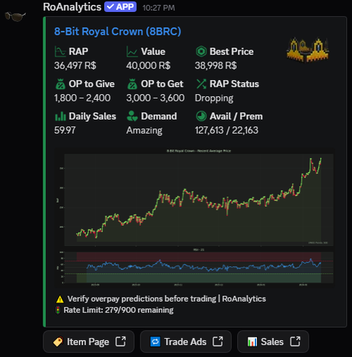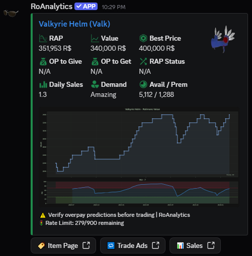 /check — View a limited's RAP, value, demand, recent sales, overpay estimates (verify before trading), and generated graphs (includes RSI)