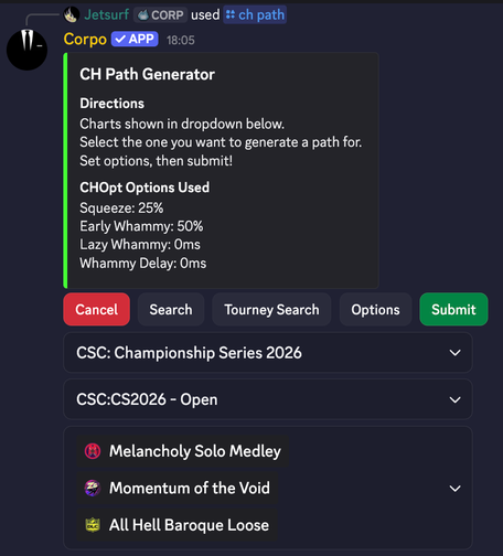 - Generate CHOpt paths from either charts on encore, or from set lists of tournaments ran by the bot.