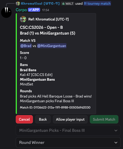 Provides a built-in discord ref-tool that allows for maximum visibility. The live-matches link allows for discord-external match progress viewing as well as stream keying to show stats from a match live!