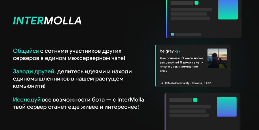 Бот InterMolla будет активен только до момента выхода финальной версии платформы под названием ReMolla Release. Следите за разработкой платформы межсерверных чатов совершенно нового уровня ReMolla в комьюнити-сервере проекта
